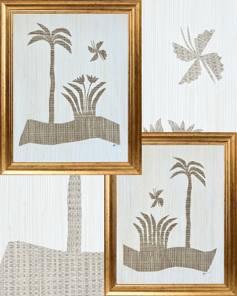 Abstract original grasscloth landscape botanical study in gilded frame with overall dimensions of 13.5 inches x 16.5 inches